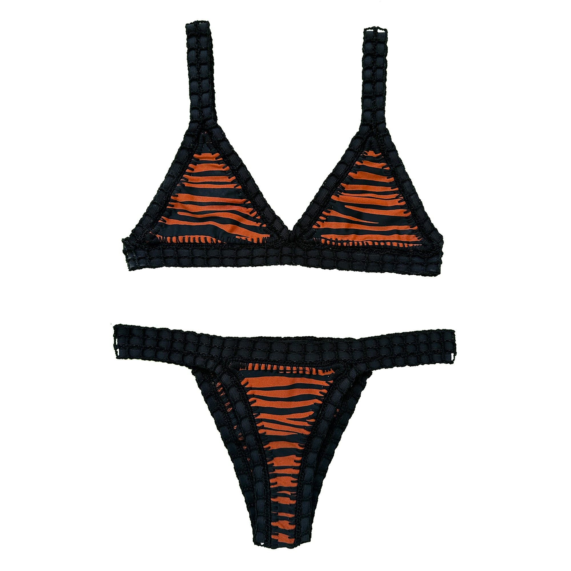 Africa channels the strength and allure of animal print with tiger-inspired stripes in rich earthy tones and deep black. Handcrafted with black crochet trim and ultra-soft, body-hugging fabric, this bikini delivers comfort, support, and a head-turning look.